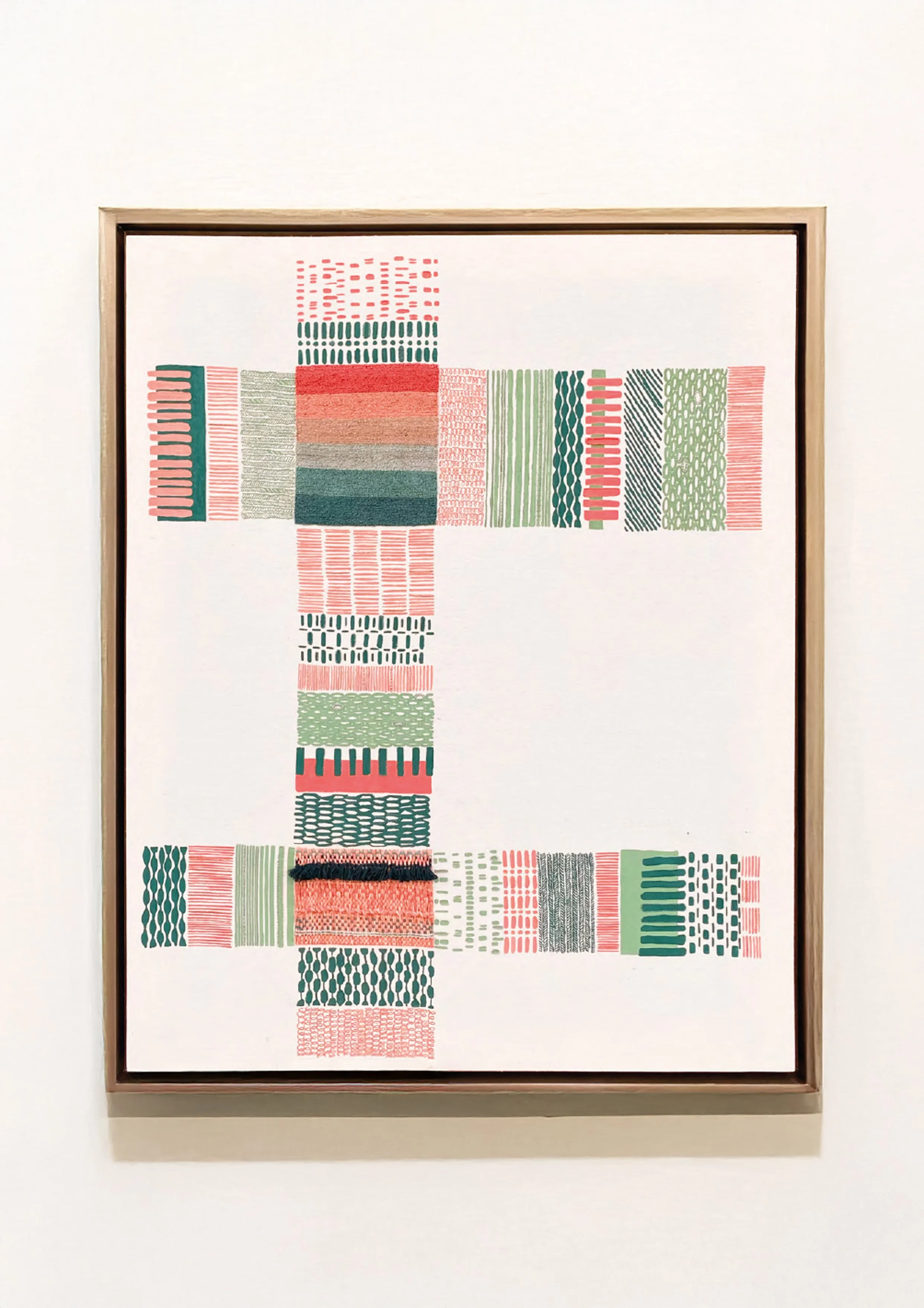 Rooted in a rich vocabulary of weaving patterns, the work translates textile language through painting, hand weaving, and embroidery, creating a layered dialogue between material, gesture, and craft.